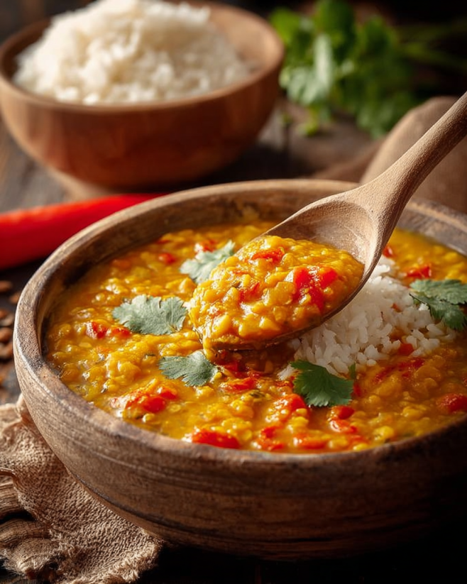 Cremiges Paprika Dal mit Reis Rezept einfach zubereiten.